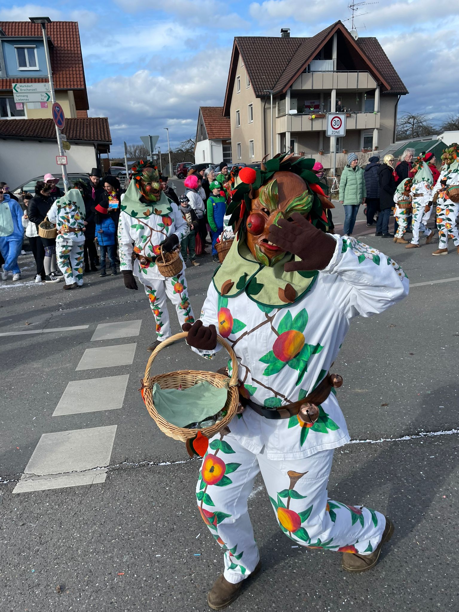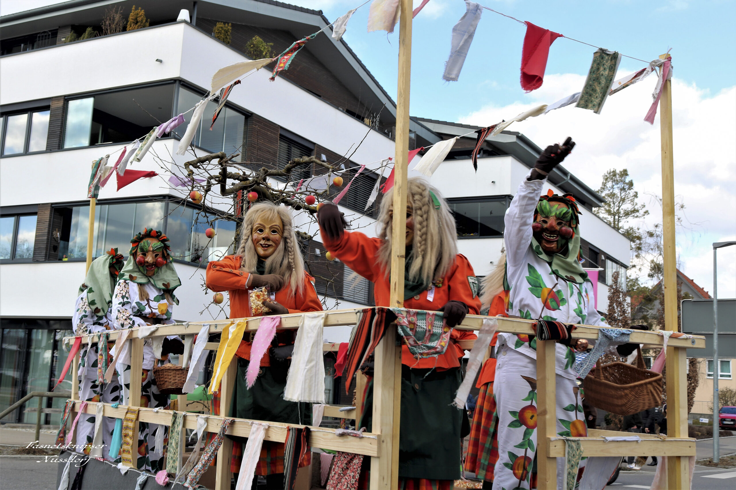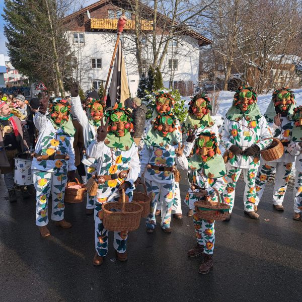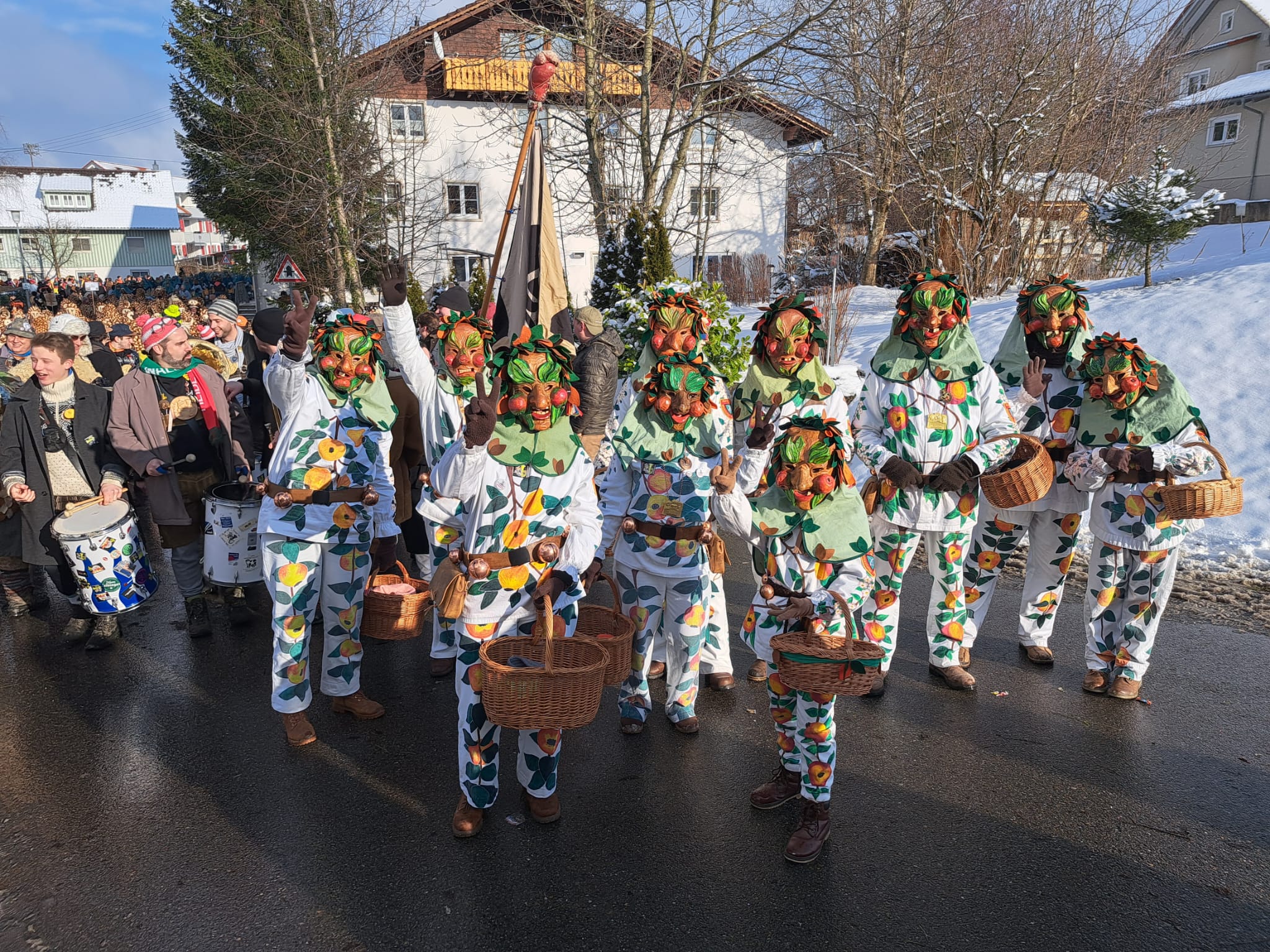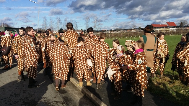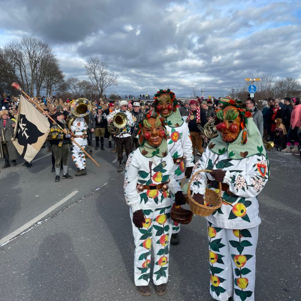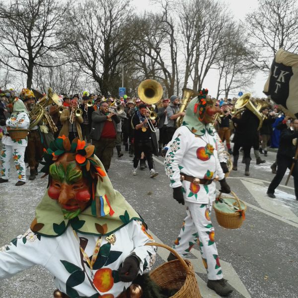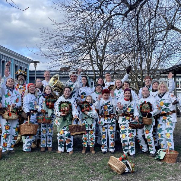 Unsere Epfelbroggere, mit Masken aufsetzen beschäftigt, beim Umzug in Kressbronn am 24.02.2019