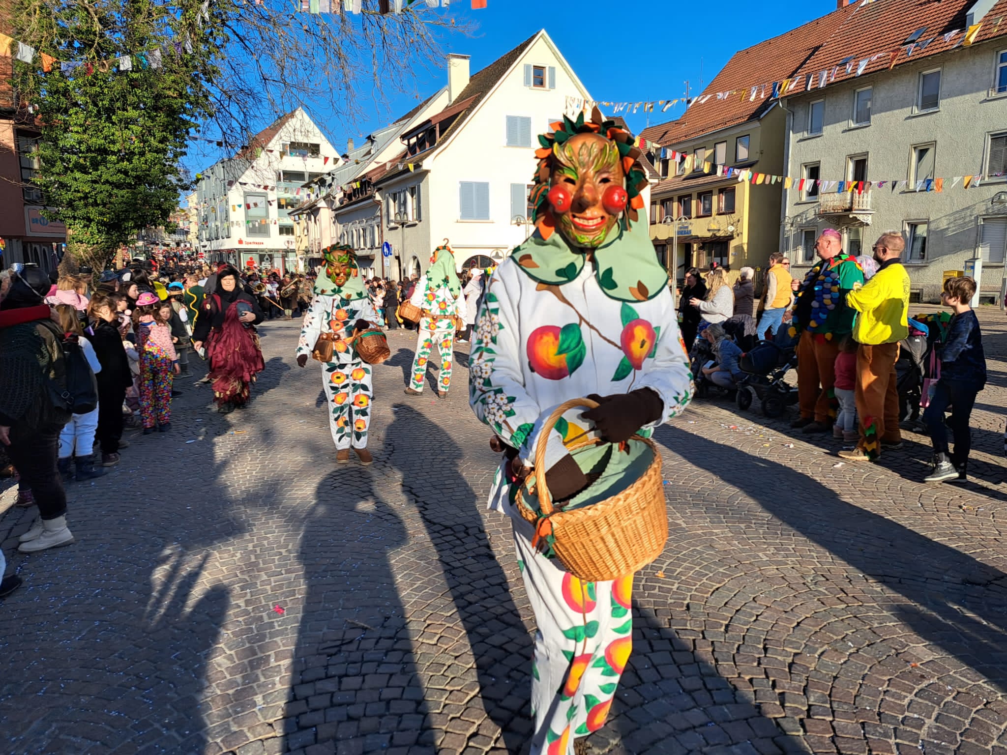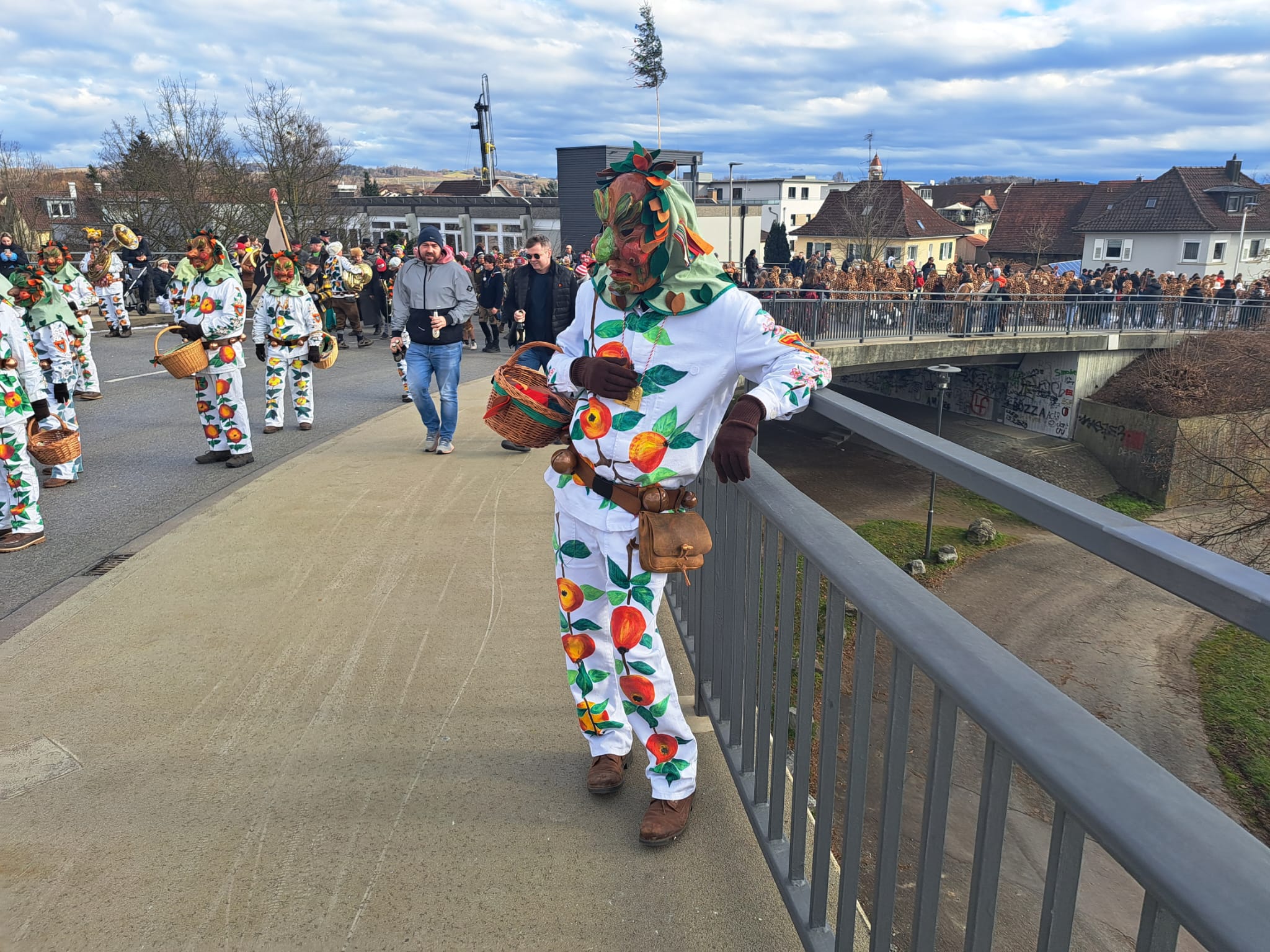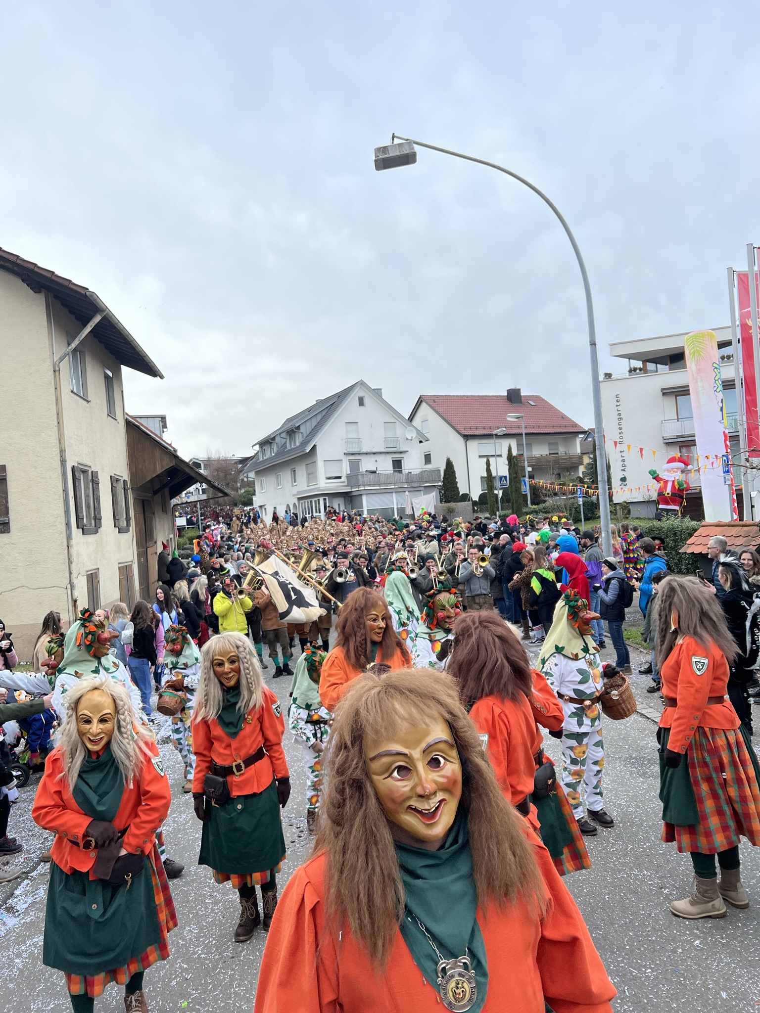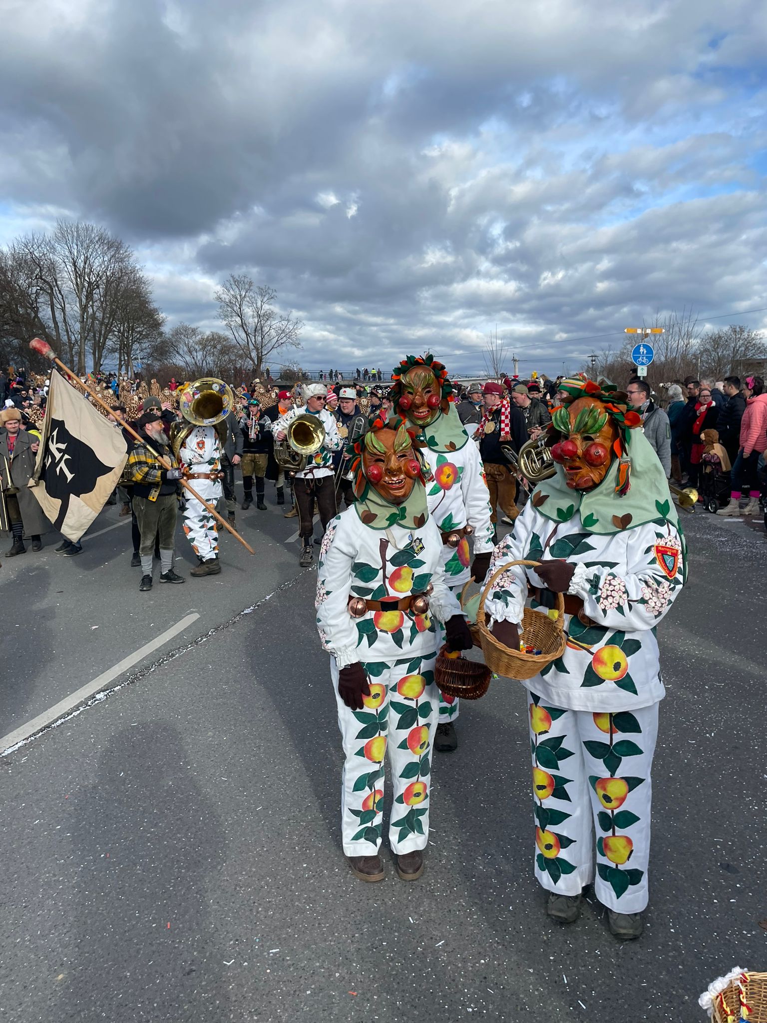 Unsere Epfelbroggere, mit Masken aufsetzen beschäftigt, beim Umzug in Kressbronn am 24.02.2019