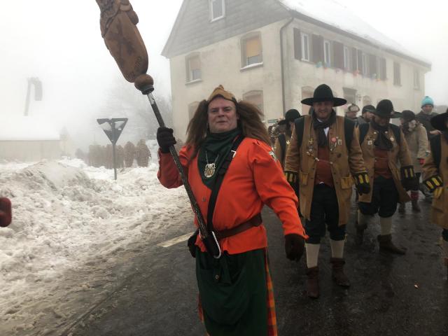 1. Zunftmeister Stefan Amann mit den Epfelbroggere vor dem legendären Gasthaus Ochsen beim Umzug in Ratzenried am 26.01.2020
