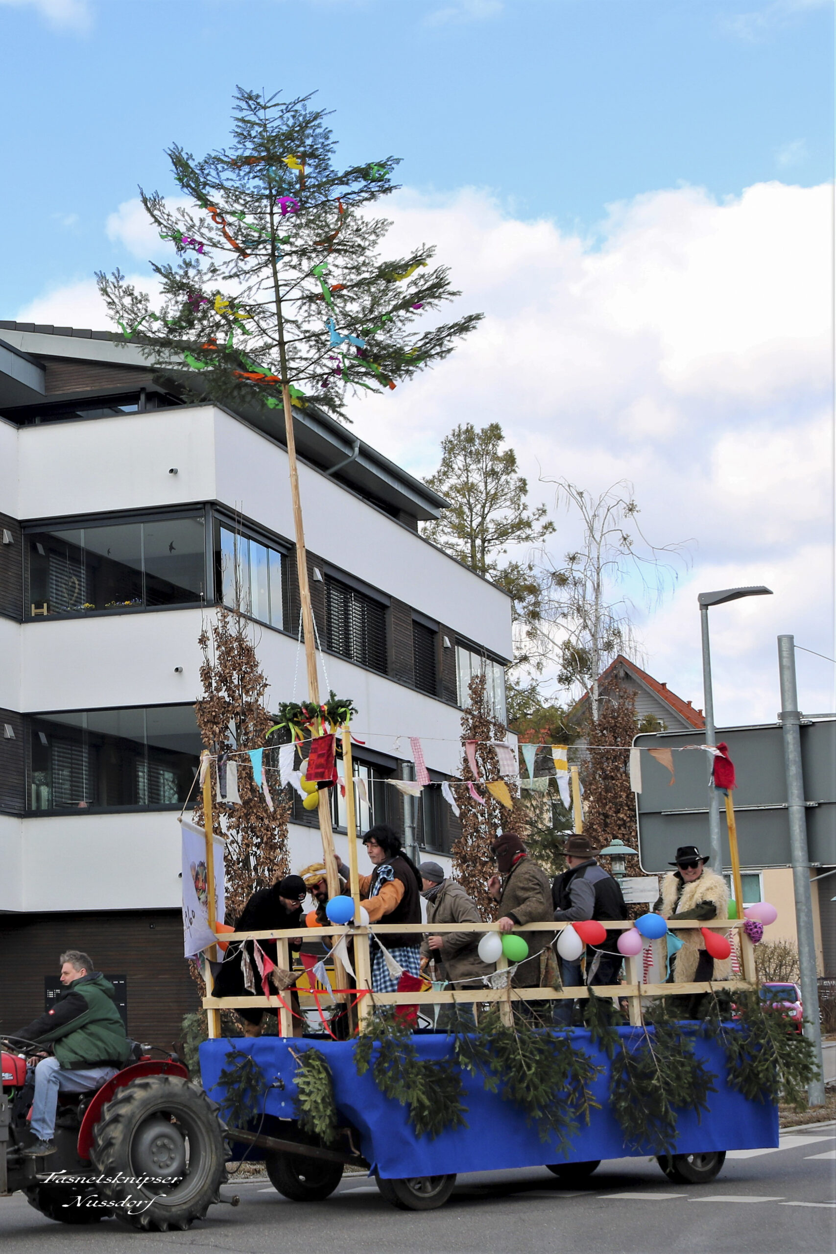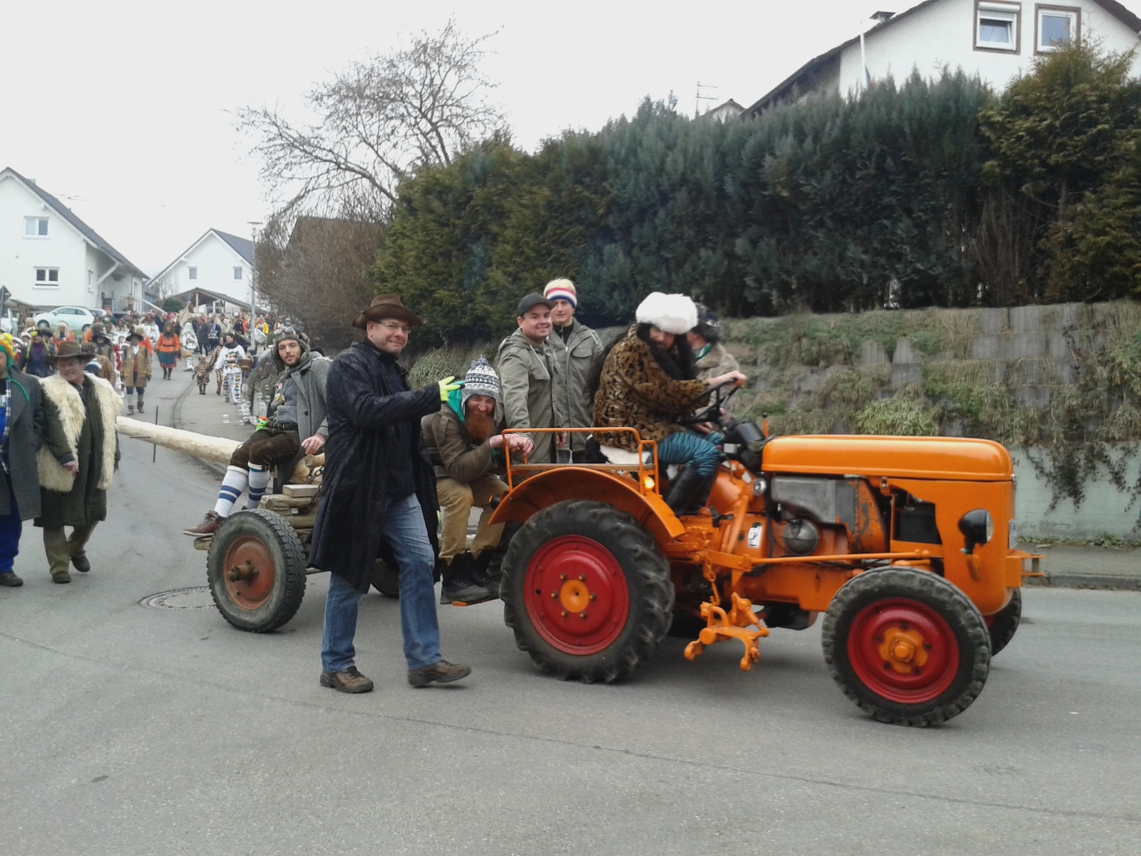 Manne zieht am 27.01.2018 mit seinem Porschetraktor den Narrenbaum ins Dorf