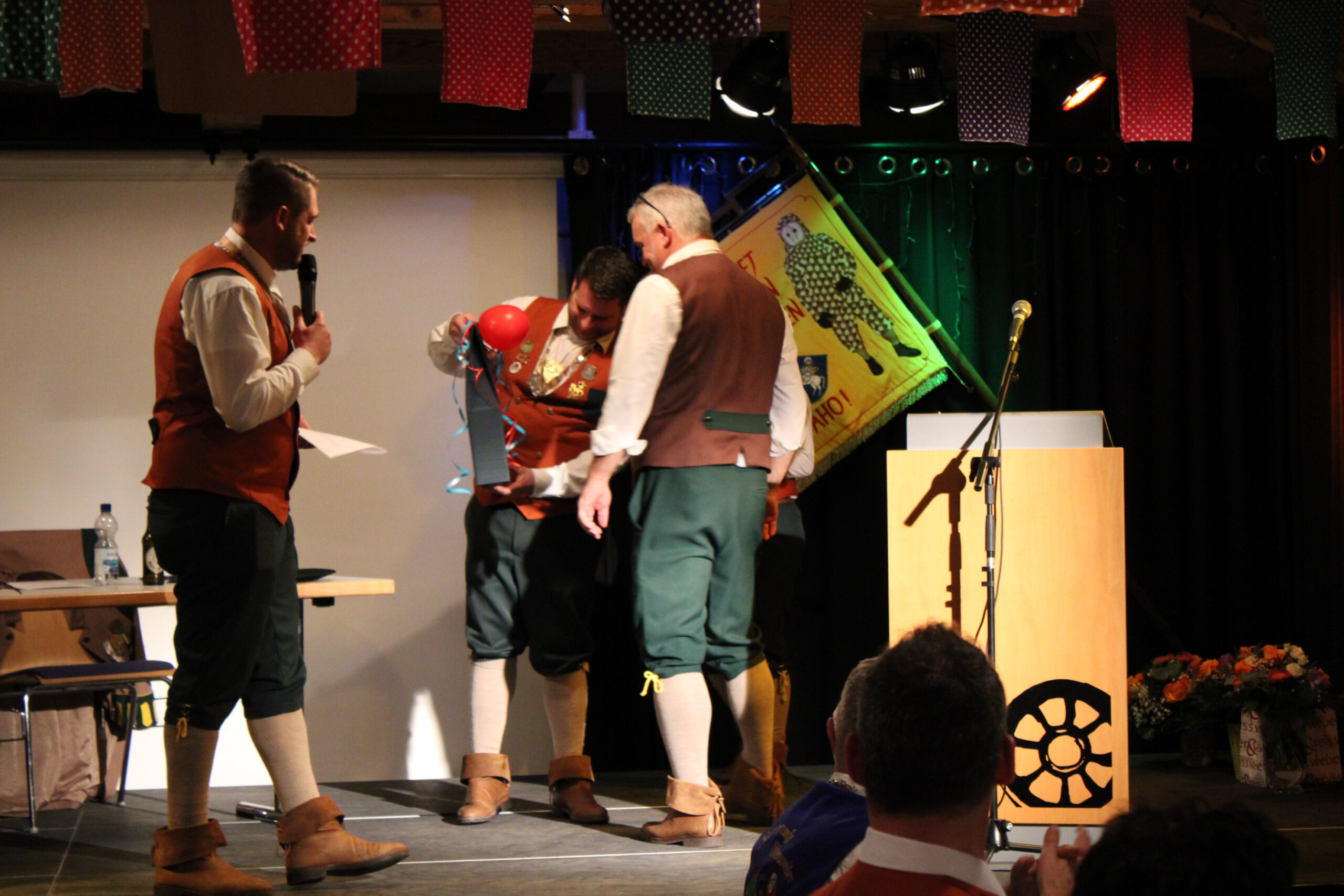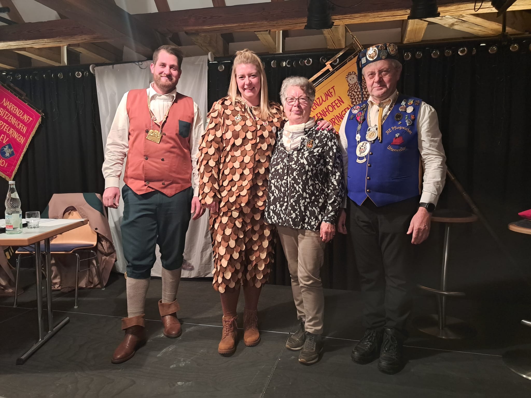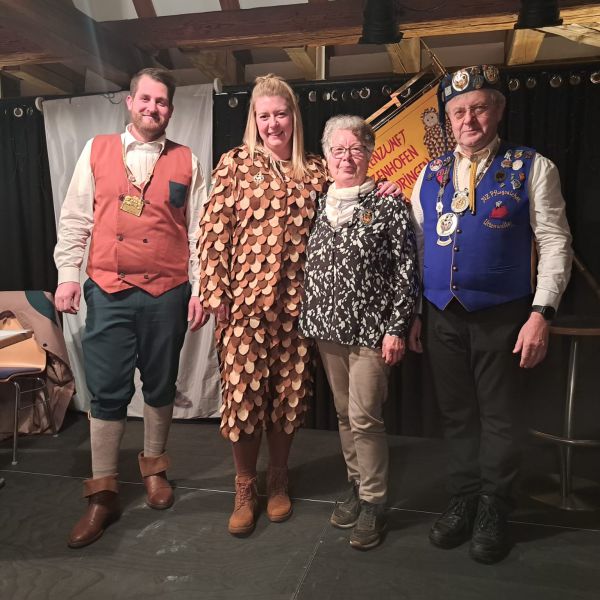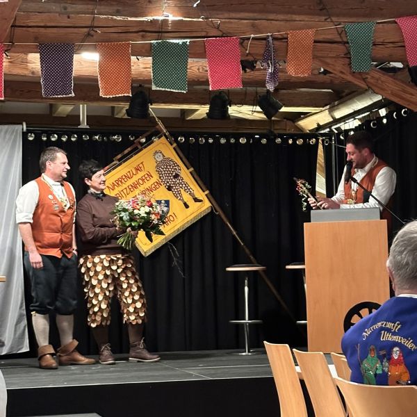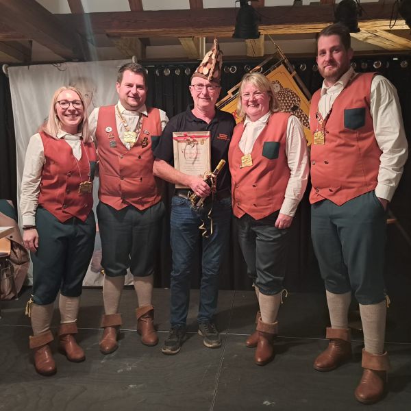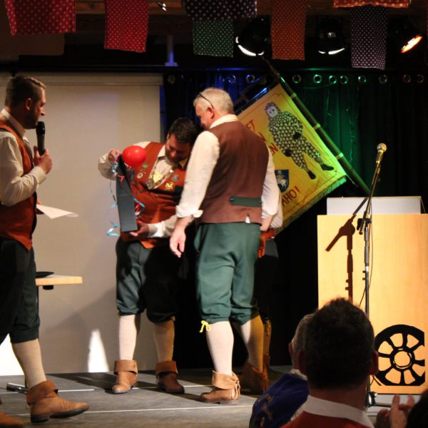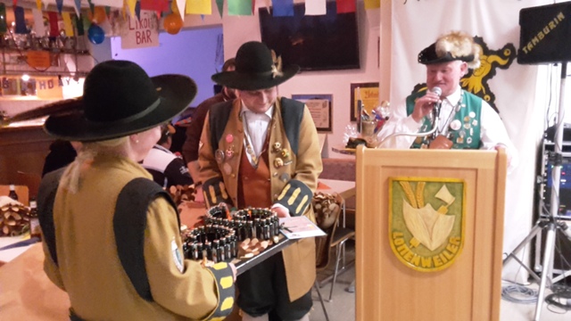Jessi und Alex überreichen Nickel unser Gastgeschenk zum 66-jährigen Jubiläum unserer Gette Zunft Lottenweiler