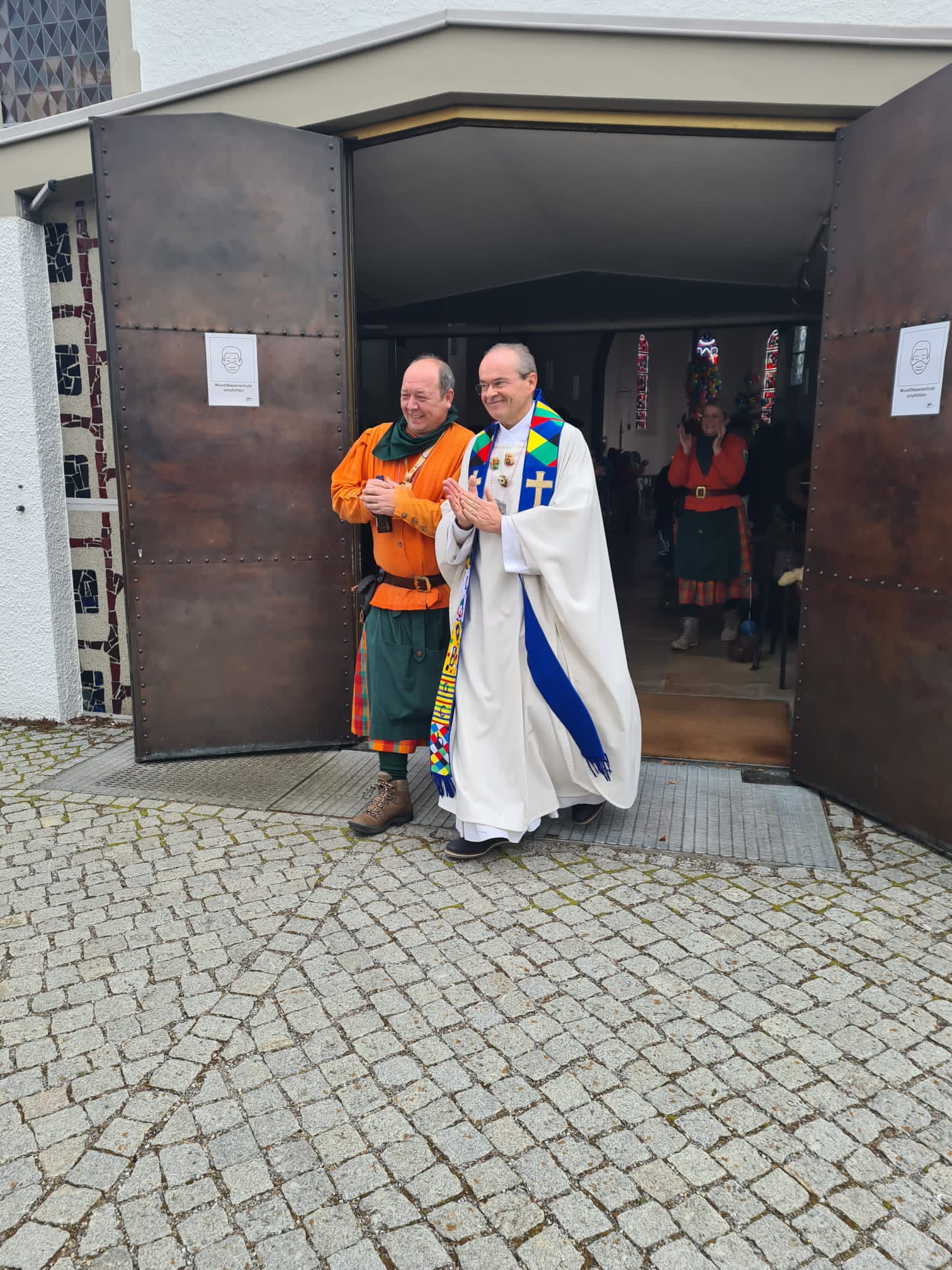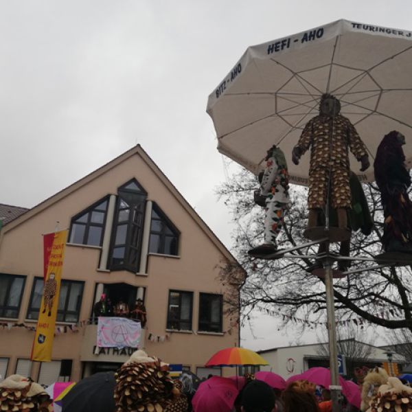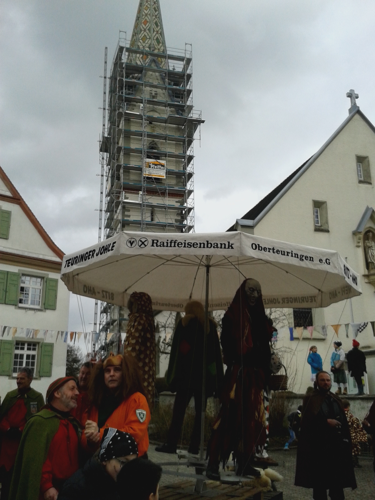 Das Narrensymbol vor dem damals eingerüsteten Kirchturm kurz vor dem Stellen beim Schul- und Rathaussturm am 24.02.2017