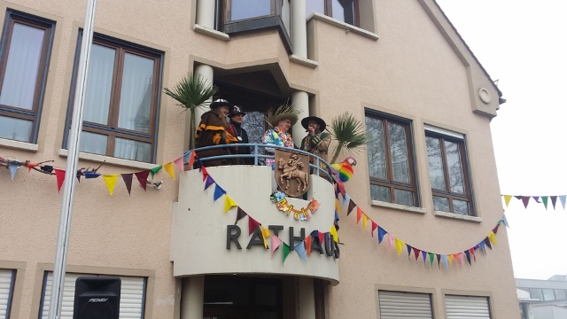Die Teuringer Zunftmeister mit Bürgermeister Beck beim Schul- und Rathaussturm am 13. Februar 2015
