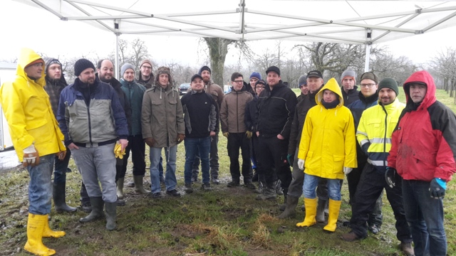 Die Funkenbauer bei ordentlichem Sauwetter am 18.02.2018 am Funkenplatz in der Weilerstrasse oberhalb von Bitzenhofen