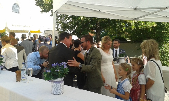 Kirchliche Hochzeit von Petra und Alex am 19. September 2015 mit der LKT-Abordnung vor dem Rathaus