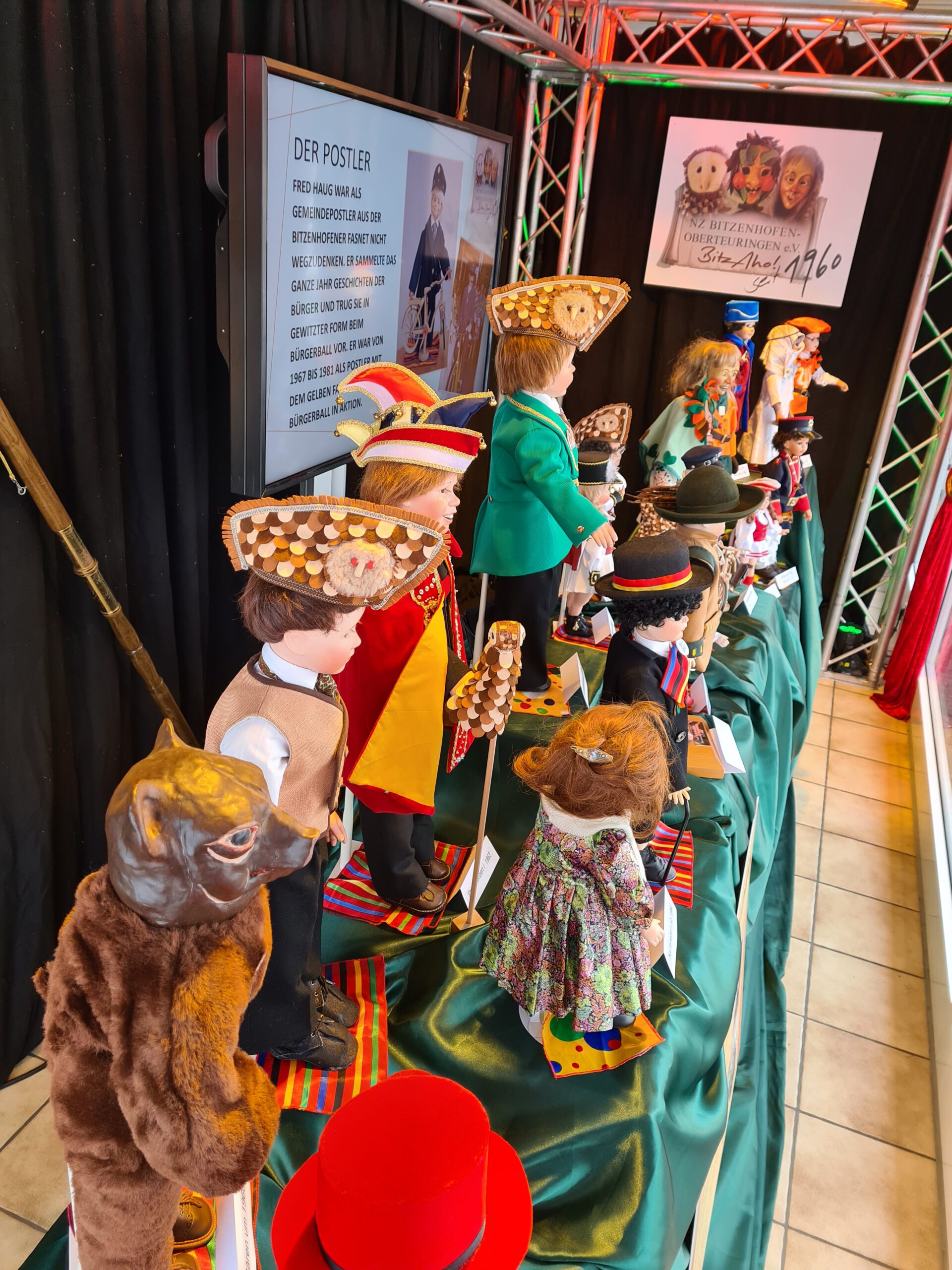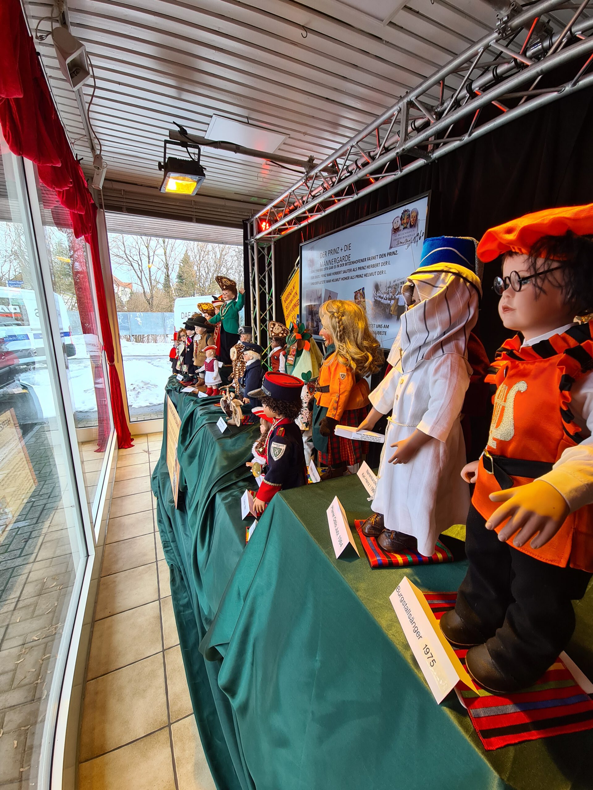 Eine Ausstellung selbstgenähter Puppen der Familie Günther und Monika Rueß im Schaufenster beim Elektro Bucher.