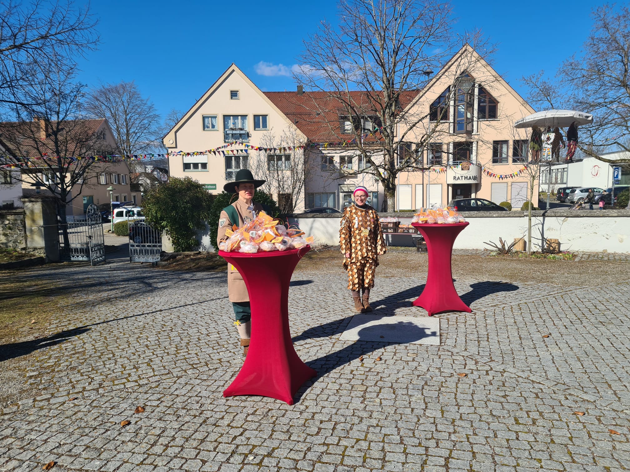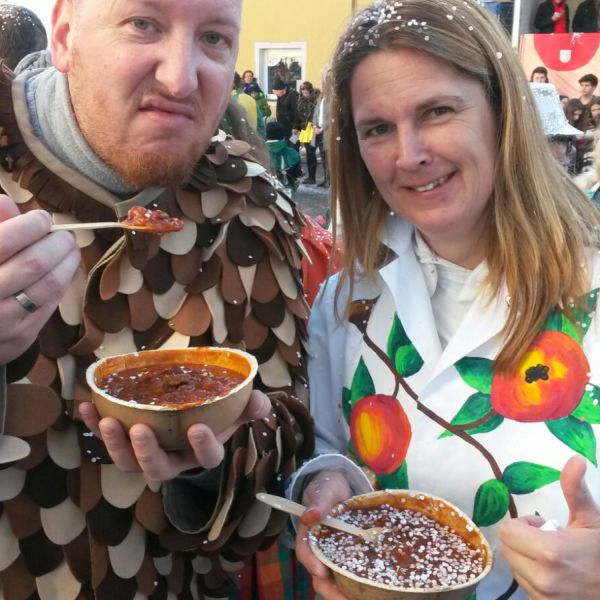 Marion und Reini genießen ihre Gulaschsuppe mit Einlage beim Umzug in Ratzenried