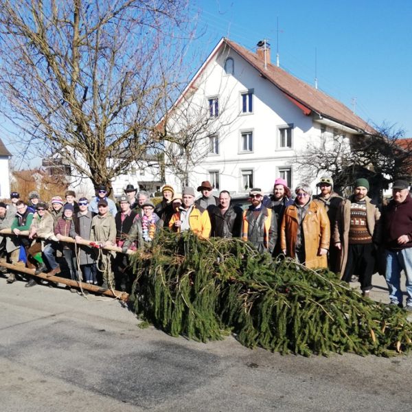 Der Jubiläumsbaum steht beim Narrenbaumsetzen in Bitzenhofen am 01.02.2020
