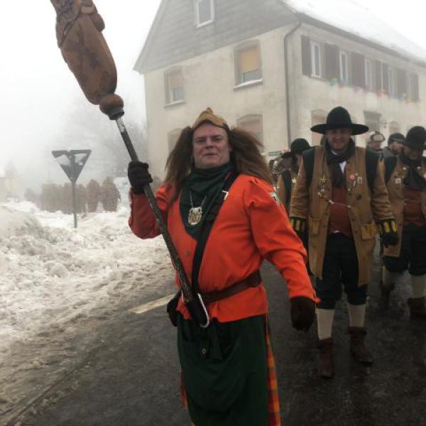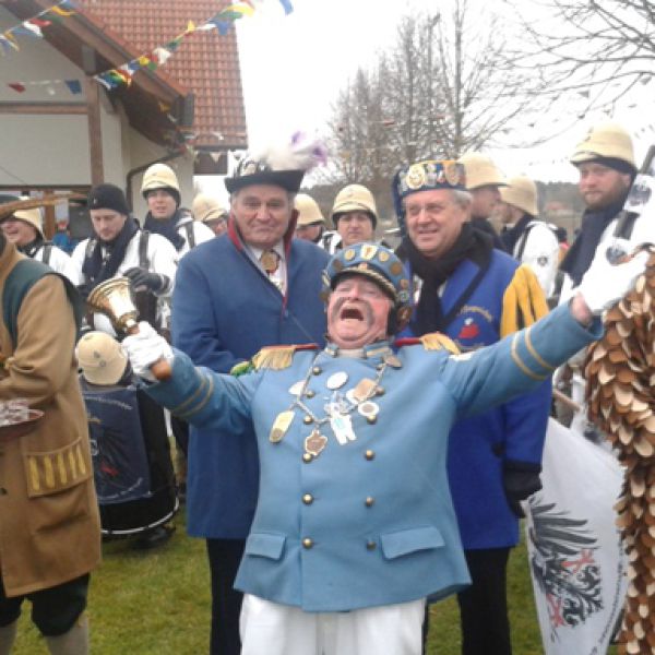 Lottenweiler Vizezunftmeister Gonzo mit den Großkopfete beim Narrenbaumsetzen in Lottenweiler am 12. Februar 2015